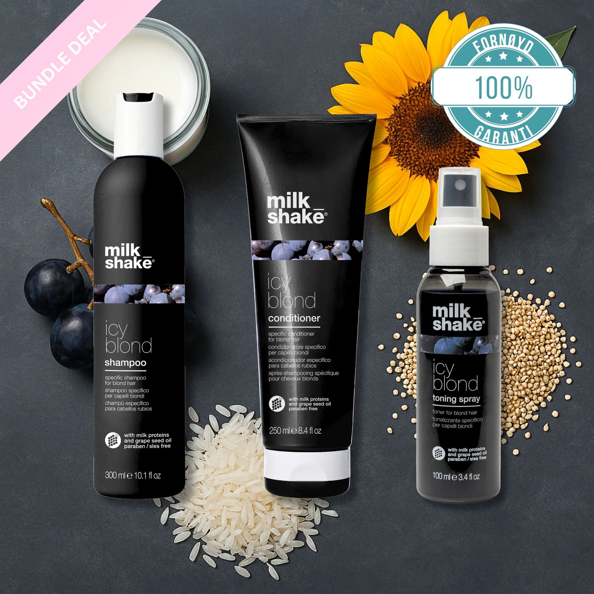 Opplev et kjøligere, klarere og mer strålende blondt hår med vårt Icy Blond Refresh Bundle fra Milk_Shake. Denne pakken er nøye sammensatt for å nøytralisere uønskede gultoner, gi intens pleie og etterlate håret silkemykt og glansfullt – perfekt for blondt, lysnet eller grått hår.