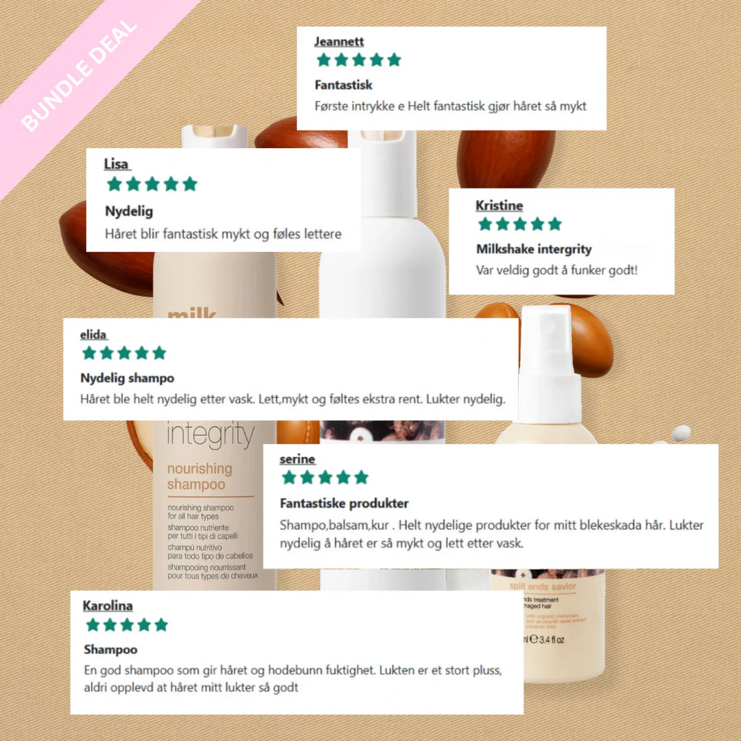 Strength and Repair for Your Hair Bundle kombinerer rens, intensiv behandling og målrettet pleie – alt du trenger for å styrke håret fra innsiden og gi det en silkemyk, sunn finish.