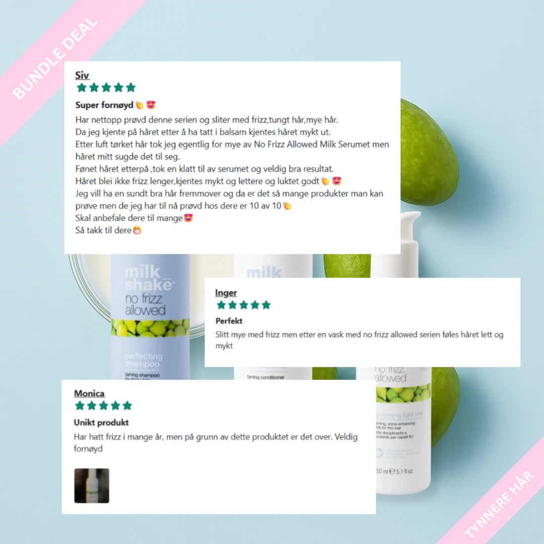 Hils på den ultimate løsningen for deg som sliter med krusete hår! No Frizz Allowed Bundle fra Milk_Shake temmer uregjerlige lokker, tilfører næring og gir håret en fantastisk glatt finish – uten å tynge.